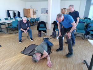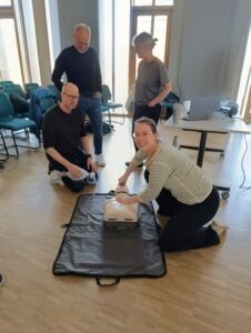 Nach einer Pause mit Getränken, Kuchen und intensivem Austausch ging es mit dem Thema Wiederbelebung weiter. In der Theorie wurden die Grundlagen der Herzdruckmassage sowie der Einsatz eines AEDs vermittelt.